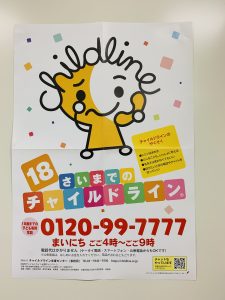 なやみがある時に、電話ができる場所です。だれかに、いじめられていたり、たたかれたり、そんな事がある時には、電話をしてくださいね。チャイルドライン佐久は18歳までのこども専用の電話相談です。お名前は言わなくても大丈夫です。ヒミツをまもり、どんな事も一緒に考え、電話を切りたいときには切っても大丈夫です。子どもの心に寄り添い、気持ちを受け止めています。チャイルドラインは、このような子どもの現状を一人でも多くの大人に知ってもらい、生きやすい社会・希望をもてる環境作りを発信していく活動体です。